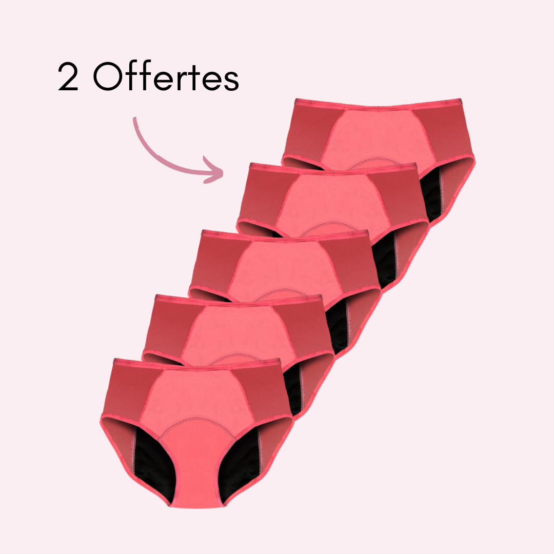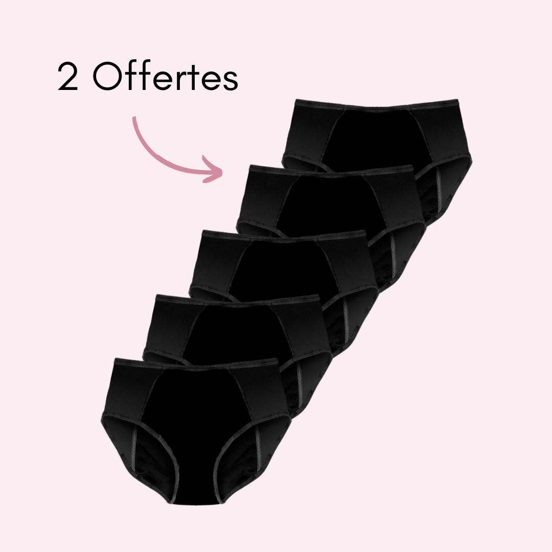 Votre culotte menstruelle Clara vous permet d'être au sec jusqu'à 12H, grâce à ses 4 couches absorbantes qui peuvent contenir l'équivalent de 4 tampons. Vous n'aurez plus besoin d'acheter chaque mois des protections hygiéniques car vos culottes sont réutilisables. Vos culottes menstruelles sont également adaptées pour les fuites urinaires.