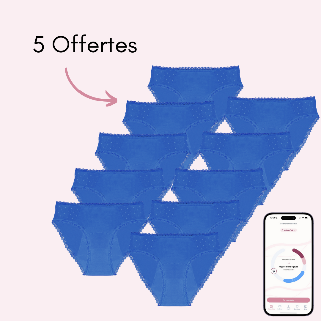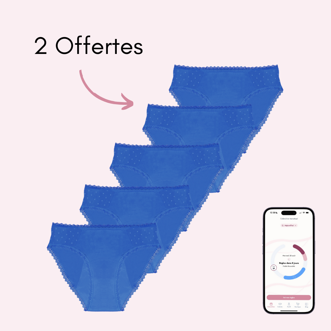 Votre culotte menstruelle Manon vous permet d'être au sec jusqu'à 12H, grâce à ses 4 couches absorbantes qui peuvent contenir l'équivalent de 4 tampons. Vous n'aurez plus besoin d'acheter chaque mois des protections hygiéniques car vos culottes sont réutilisables. Vos culottes menstruelles sont également adaptées pour les fuites urinaires.